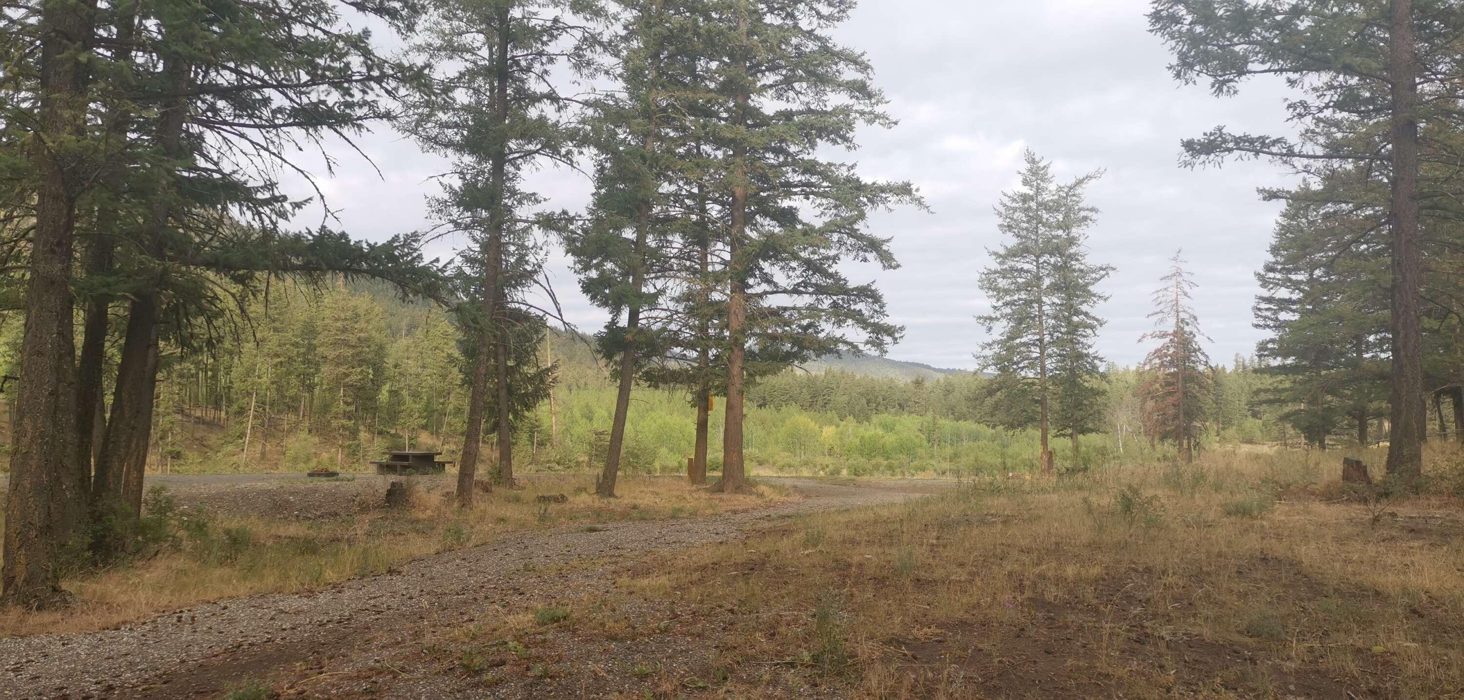 Après avoir quitté Salmon Arm, nous avons roulé un bon moment de nuit pour arriver un peu par hasard sur un campground en limite d’une vaste zone d’exploitation forestière : Pendleton recreation site. Nous n’installons pas de tente et dormons directement dans la voiture. Au petit matin j’en profite pour faire un petit tour dans le camp. Il y a peu d’oiseaux mais je rajoute quelques espèces à la liste comme le bruant familier et le tarin des pins. Une moucherolle attaque son petit déj, dur de dire s’il s’agit d’une moucherolle des aulnes ou des saules, je n’arrive même pas à voir la différence dans le guide ! Nous attaquons la route et faisons encore quelques espèces sur la piste comme un joli tyran tritri. Le ciel est encore sombre et c’est dans une ambiance austère que nous arrivons dans la vallée de Thompson river.