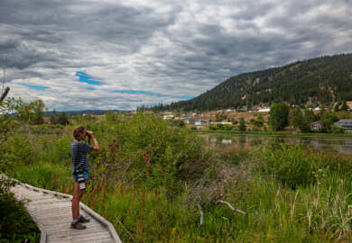 Nous faisons un premier arrêt depuis le point de vue sur le lac Kamloops qui s’étend sur 29 km. Deux grands corbeaux perchés au sommet d’un arbre mort semblent surveiller jalousement leur territoire.