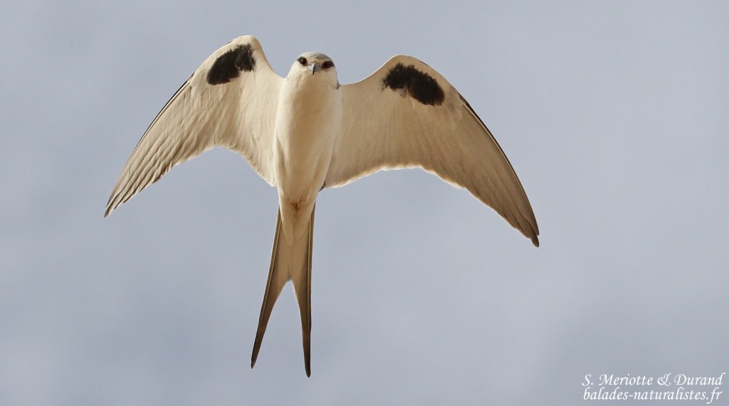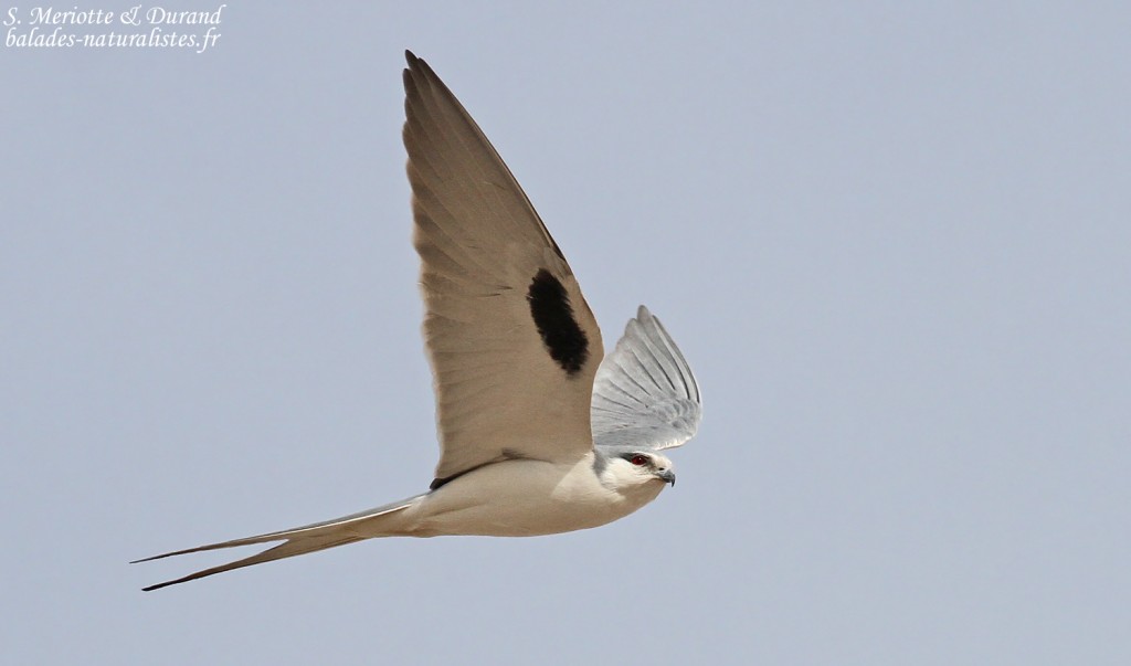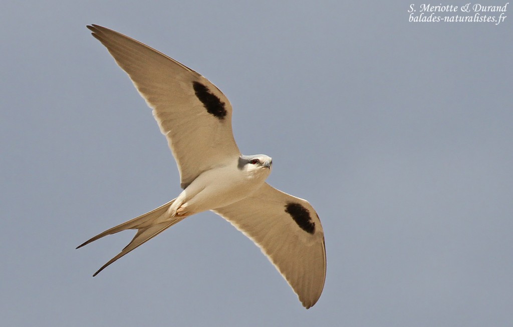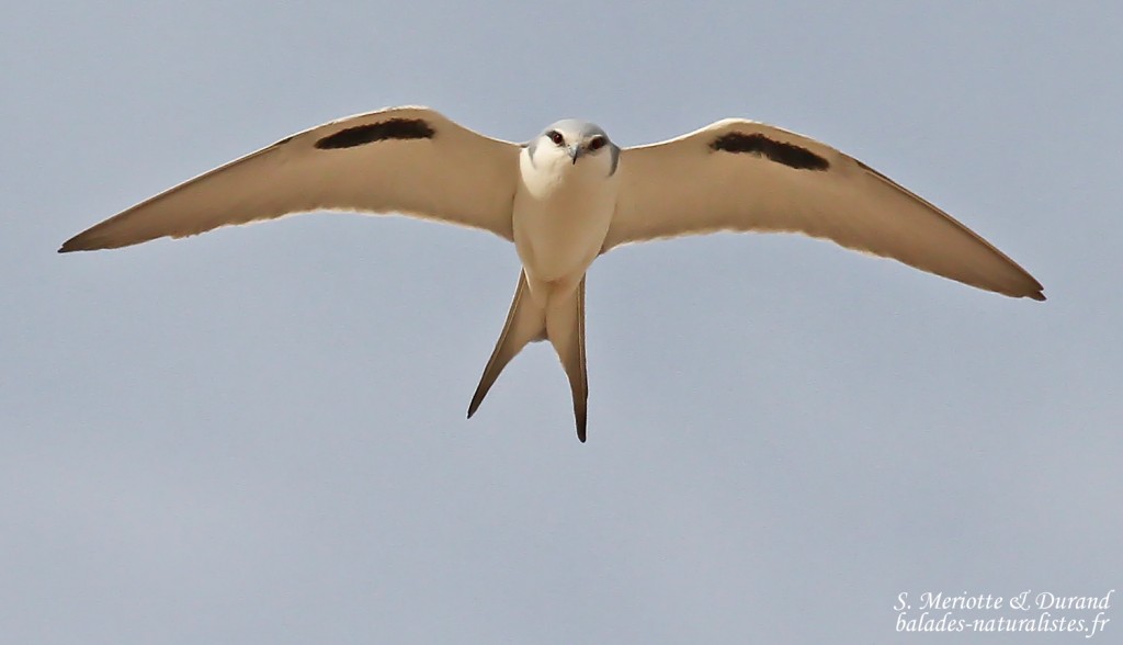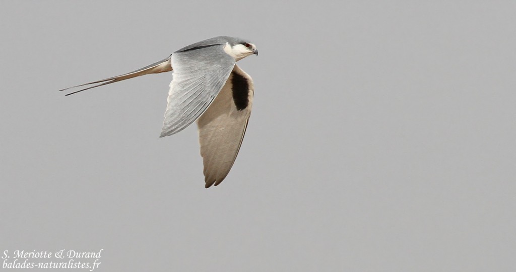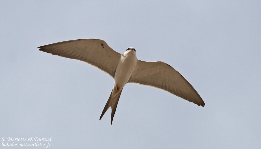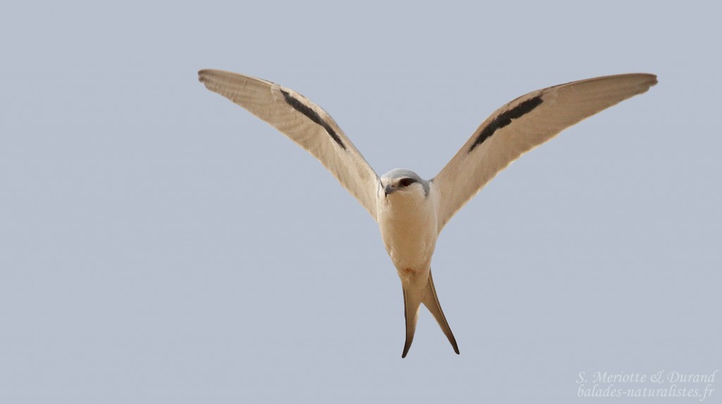 Les Crécerellettes ne sont pas les seuls à aimer les criquets et à venir se réfugier sur cette ile durant la nuit. En ce début de jour, alors que le passage des sombres Crécerellettes s’estompe, apparaissent d’élégants oiseaux au blanc plumage. Le dos légèrement plus gris, deux taches carpales noires et une longue queue profondément échancrée permettent d’identifier des Elanions nauclers.