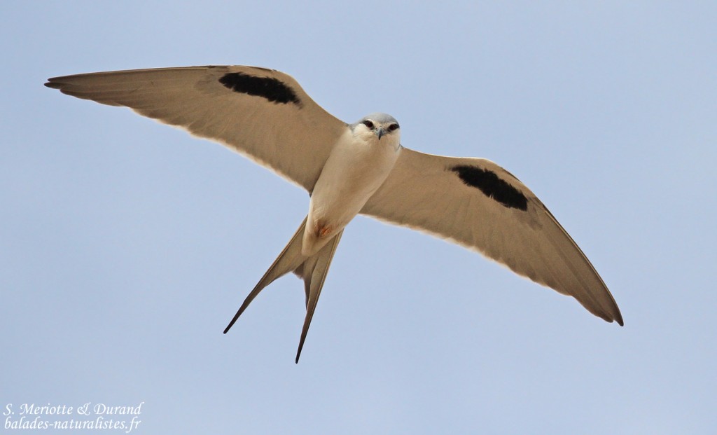 Parmi cette masse d’élanion, nous repérons un jeune. Il se distingue des adultes par une queue moins longue et moins fourchue mais surtout par l’absence des tâches carpales noires. Après réflexion et consultation de nos photos, c’est le deuxième juvénile que nous ayons identifié au cours des trois matinées passées ici à observer cette migration journalière. Surprenant, car nous n’avons pas pu passer au travers… quoique dans le nombre, il ne soit pas forcément facile de faire attention à la présence de ces fameuses tâches. Autre hypothèse, il y a peut être des dortoirs différents pour les adultes et les jeunes chez cette espèce ?