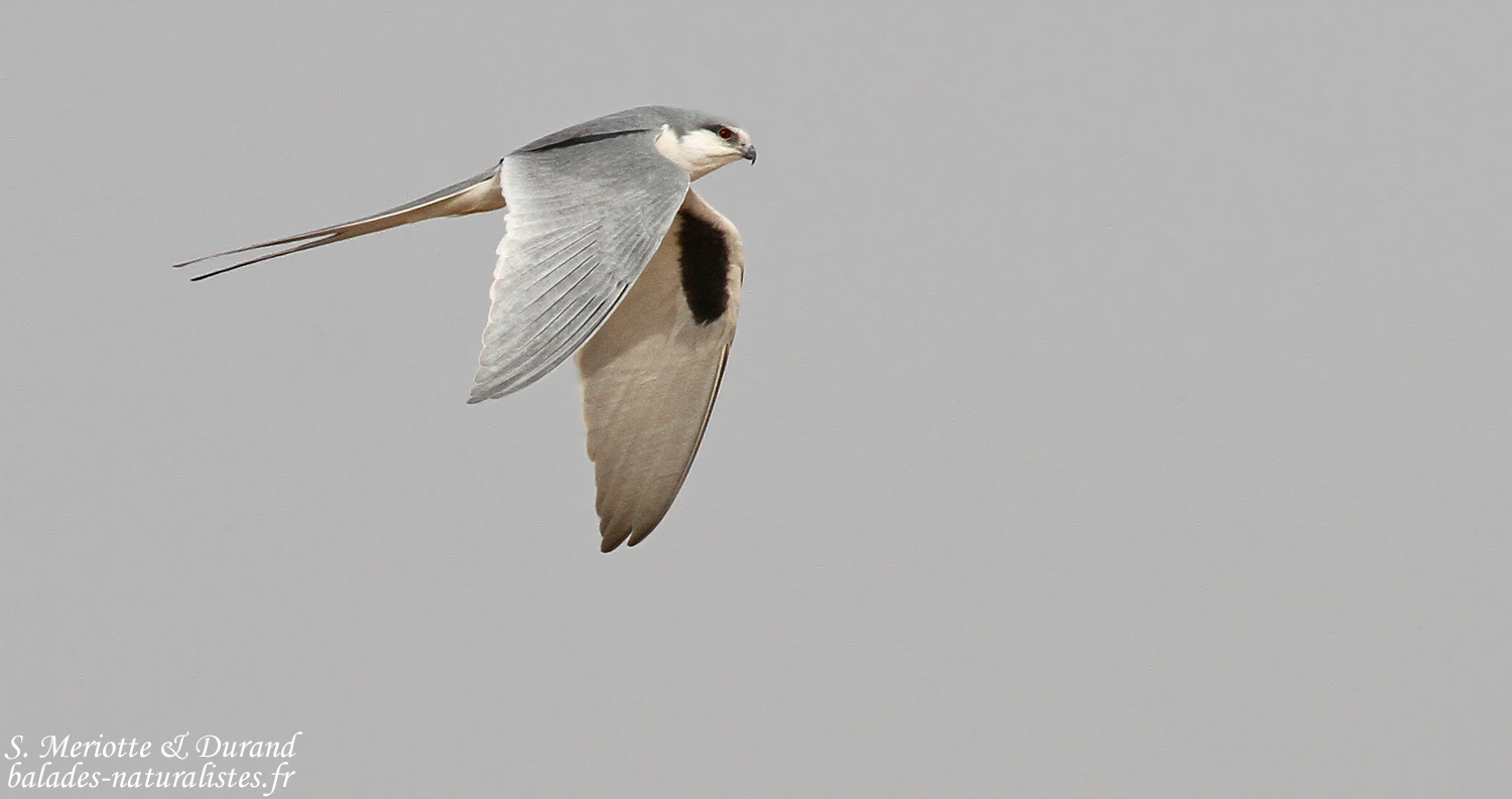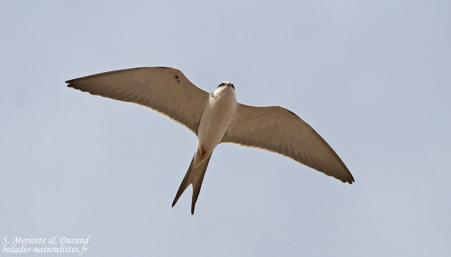 Parmi cette masse d’élanion, nous repérons un jeune. Il se distingue des adultes par une queue moins longue et moins fourchue mais surtout par l’absence des tâches carpales noires. Après réflexion et consultation de nos photos, c’est le deuxième juvénile que nous ayons identifié au cours des trois matinées passées ici à observer cette migration journalière. Surprenant, car nous n’avons pas pu passer au travers… quoique dans le nombre, il ne soit pas forcément facile de faire attention à la présence de ces fameuses tâches. Autre hypothèse, il y a peut être des dortoirs différents pour les adultes et les jeunes chez cette espèce ?