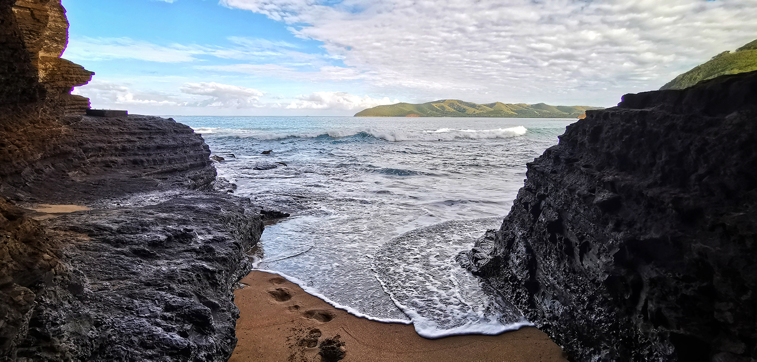 Le point de départ de la balade se situe à l’extrémité Nord-Ouest de la plage de la Roche Percée. Prenez donc le temps de pénétrer dans la faille avant de suivre le sentier qui monte le long de la falaise. Mais l »entrée n’est pas facile à trouver ! Il faut suivre le layon tracé au milieu de la végétation. On pénètre alors au coeur de la roche que l’on traverse pour atteindre un superbe point de vue sur la baie des tortues.