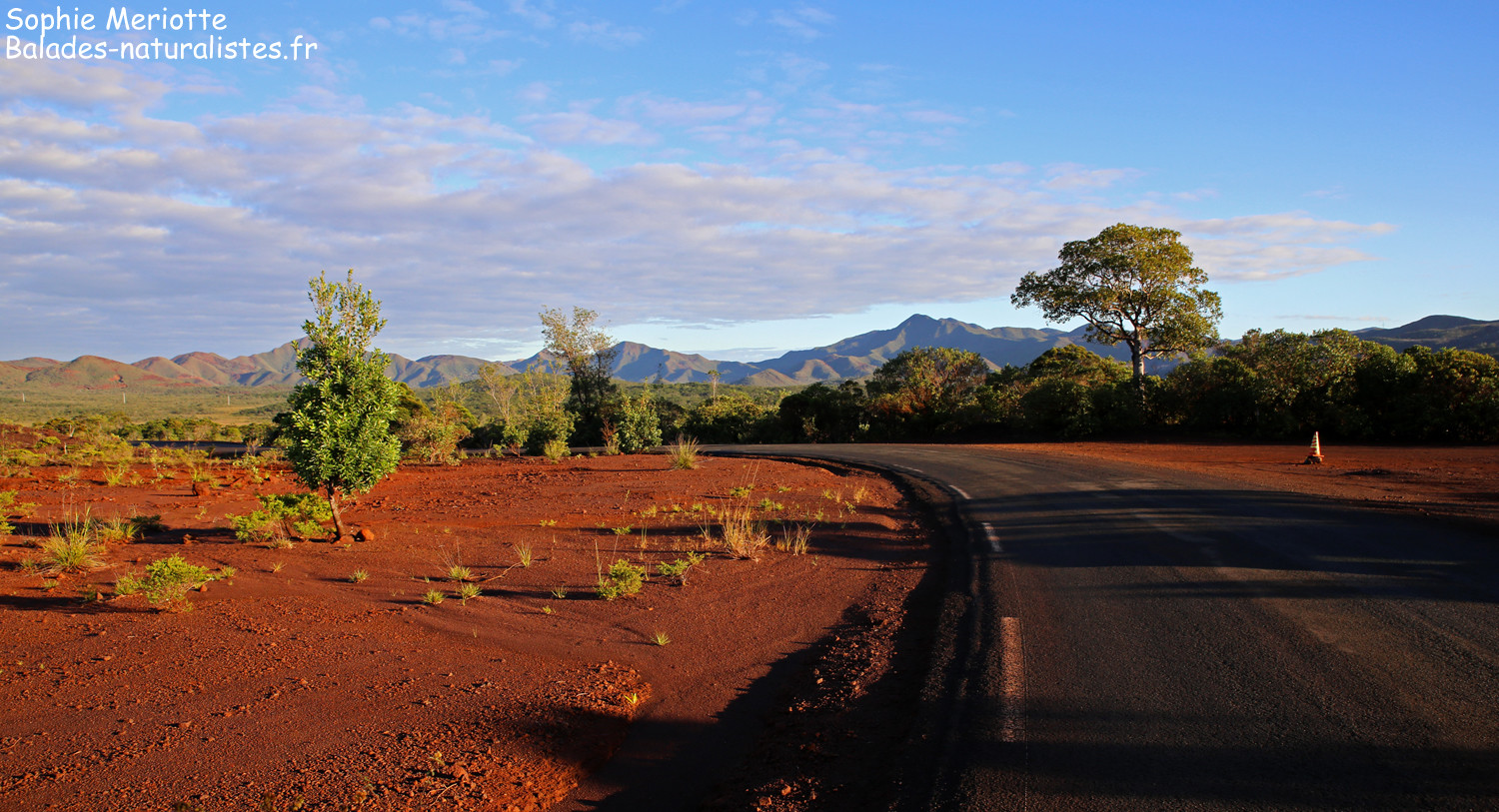 Ne nous le cachons pas, pour une adepte du whalewatching en Méditerranée, la présence des baleines à bosses durant la période hivernale en Calédonie était l’un des arguments qui avaient motivé ma démarche. Pas de chance pour moi sur ce point, elles stationnent plutôt dans le grand sud … un peu loin de Koné, environ 5 heures de route … Ce qui est largement jouable sur un week-end, et quand on aime … Et puis ce n’est pas ce genre d’expédition qui me fait peur ! 😉 Départ de Koné, vendredi après les cours et route jusqu’à Nouméa où j’arrive après 3h de route. Je ferai escale ici, il est déjà tard et rien ne sert de pousser plus loin, les routes dans le sud ne sont pas toujours très faciles. Au petit matin je reprends la route sous la belle lumière du soleil levant. Les paysages du sud sont décidément grandioses ! Ambiances lunaires rappelant les terres islandaises, ces milieux ultramaphiques sont vraiment particuliers.