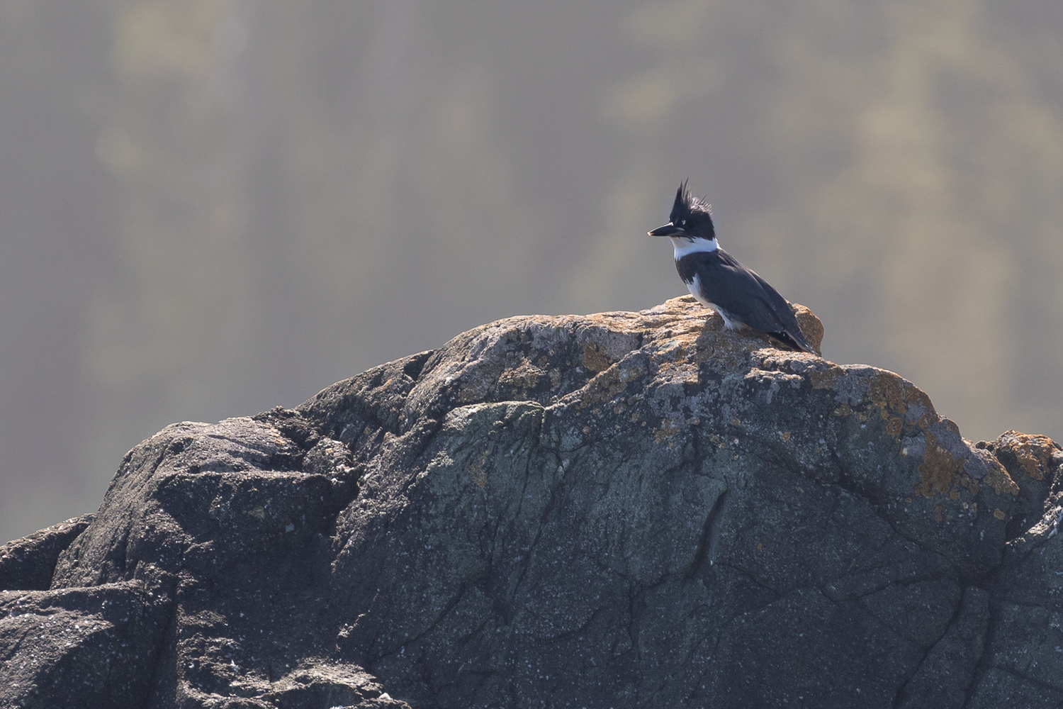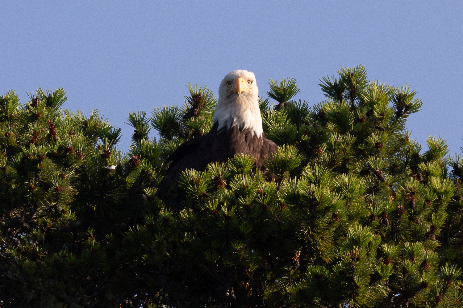 Le kayak est un très bon moyen pour observer la faune. Les animaux sont moins farouches et se laissent plus facilement approcher. Sur les rochers nous apercevons un martin-pêcheur d’Amérique. Il plonge et revient avec un poisson qu’il mange sous nos yeux. Les nombreux surmontés d’arbres offrent des postes d’affût parfaits pour les pygargues à queue blanche qui nous surveillent du coin de l’œil.