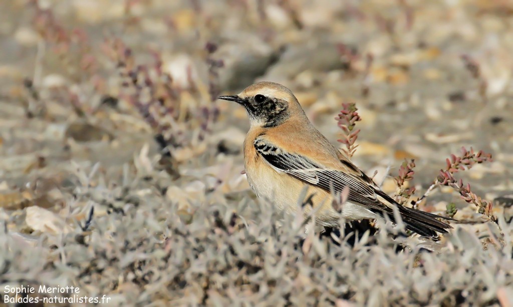 C’est vrai que cela fait désert non ? Nous finissons par retrouver l’oiseau à l’abri du vent, protégé par les buissons. Il s’agit d’une femelle, reconnaissable à son plumage sable, sa queue noire et, contrairement au mâle, l’absence de masque noir sur sa tête.