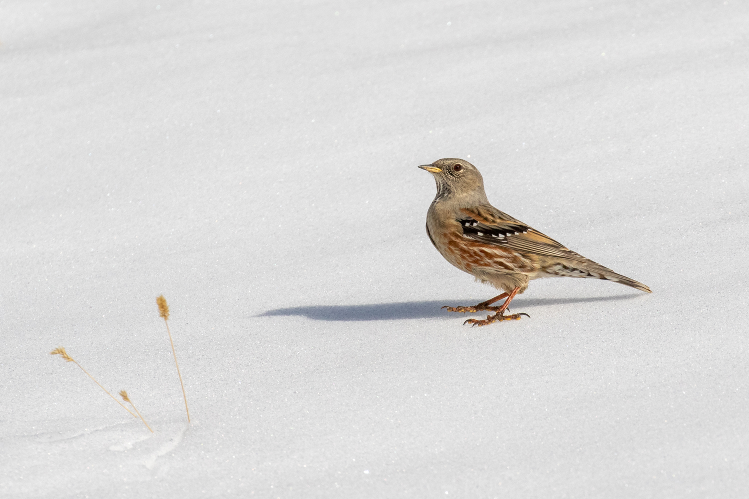 L'eau fait fondre la neige par endroit dégageant des zones enherbées qui attirent deux accenteurs alpins. Heureusement qu'ils sont là car il faut avouer qu'avec ce petit froid vif et toute cette neige les oiseaux se font bien rares ! Ils sautillent de-ci de-là, courant à toute allure sur les plaque de neige. Ils savent bien qu'avec leur plumage sombre ils ne passent pas inaperçus !