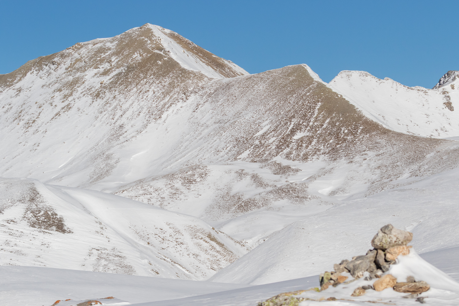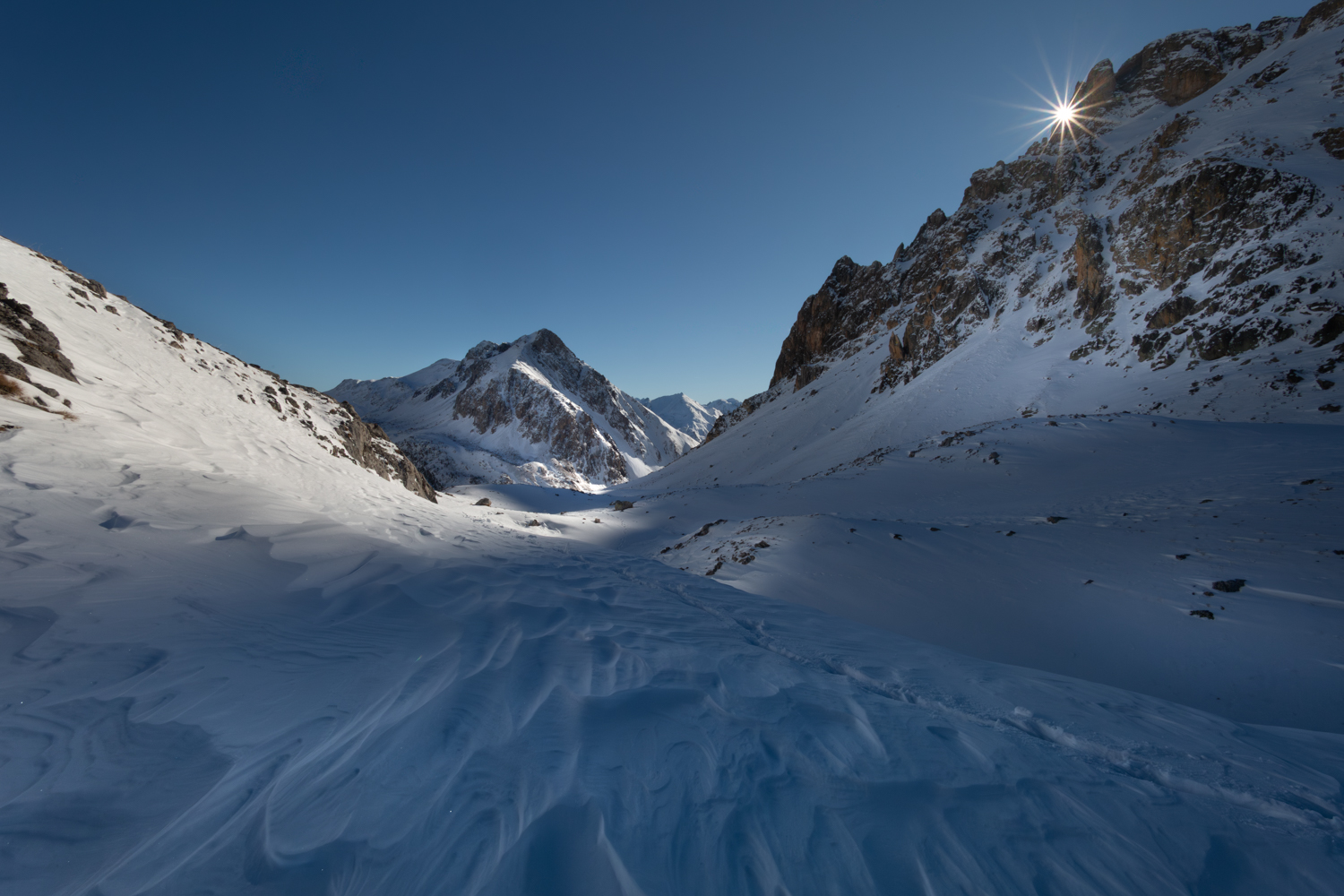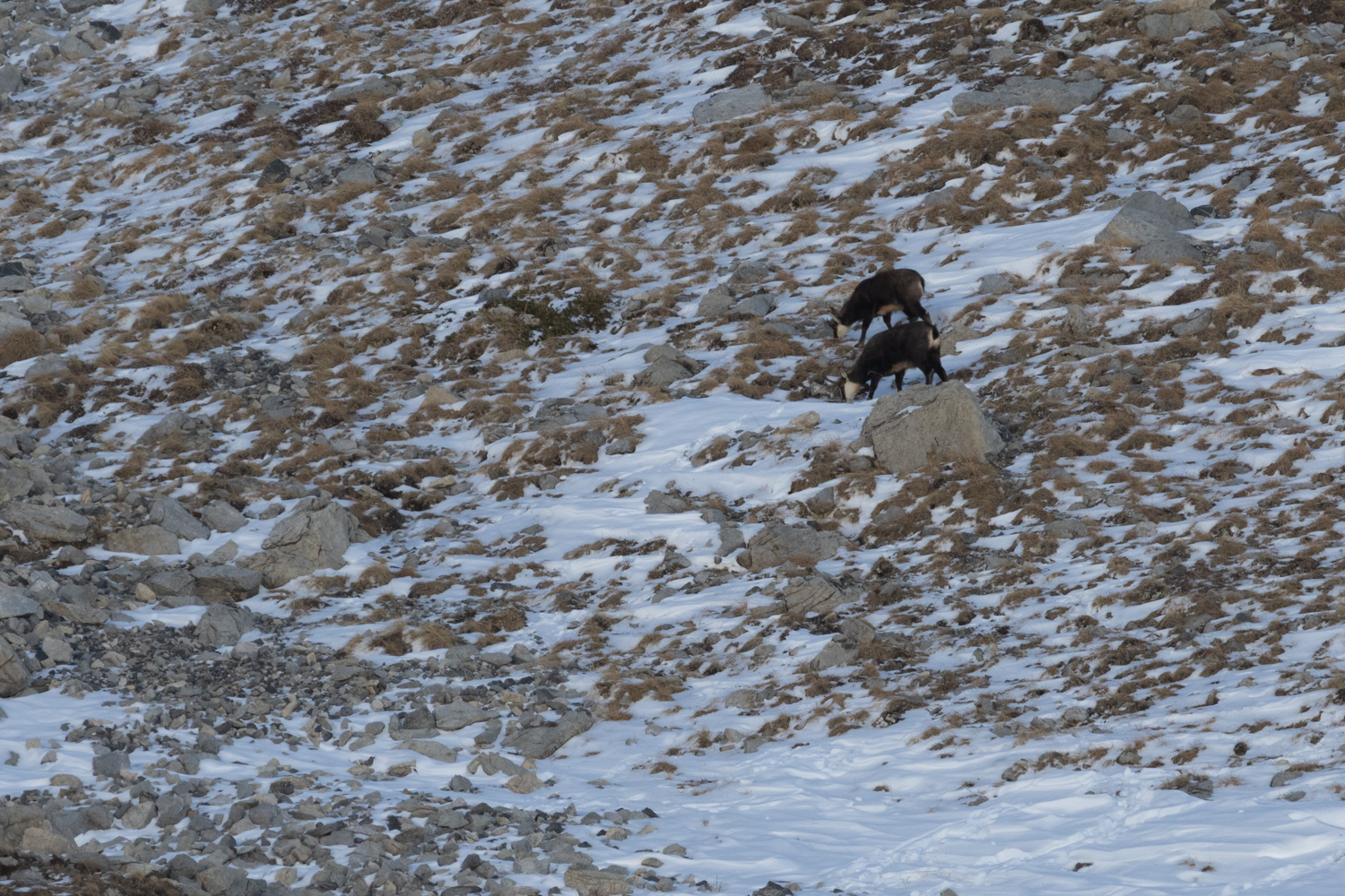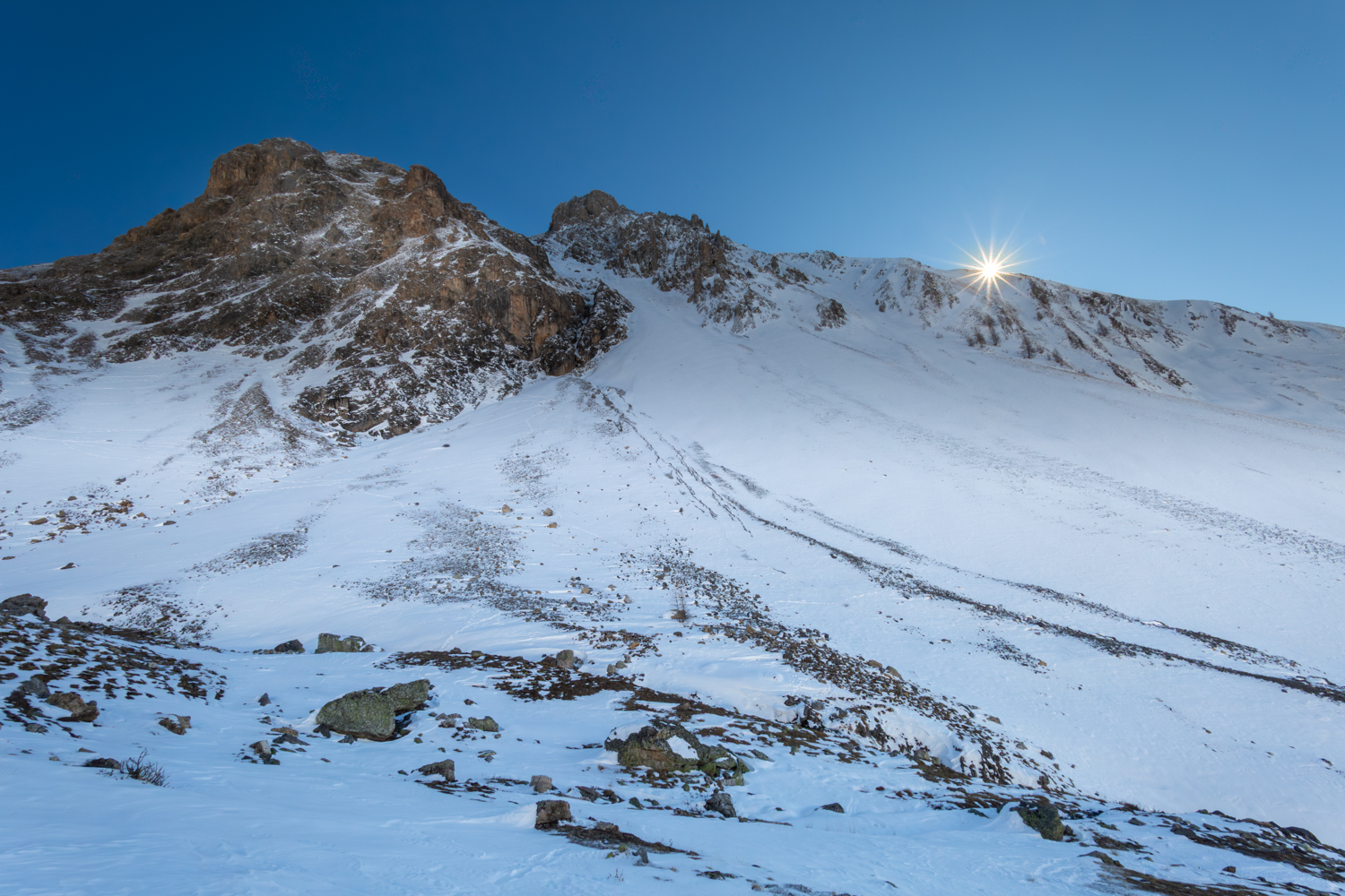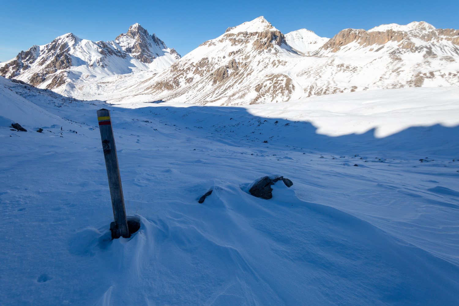 Nous continuons notre ascension vers le col et laissons sur notre droite le sentier prenant la direction de l'Italie. Prenez malgré tout le temps de scanner les versants moins enneigés, vous aurez peut-être la chance d'observer également quelques chamois. Nous profitons du cadre pour prendre un café et quelques images du soleil jouant à cache-cache derrière les crêtes.