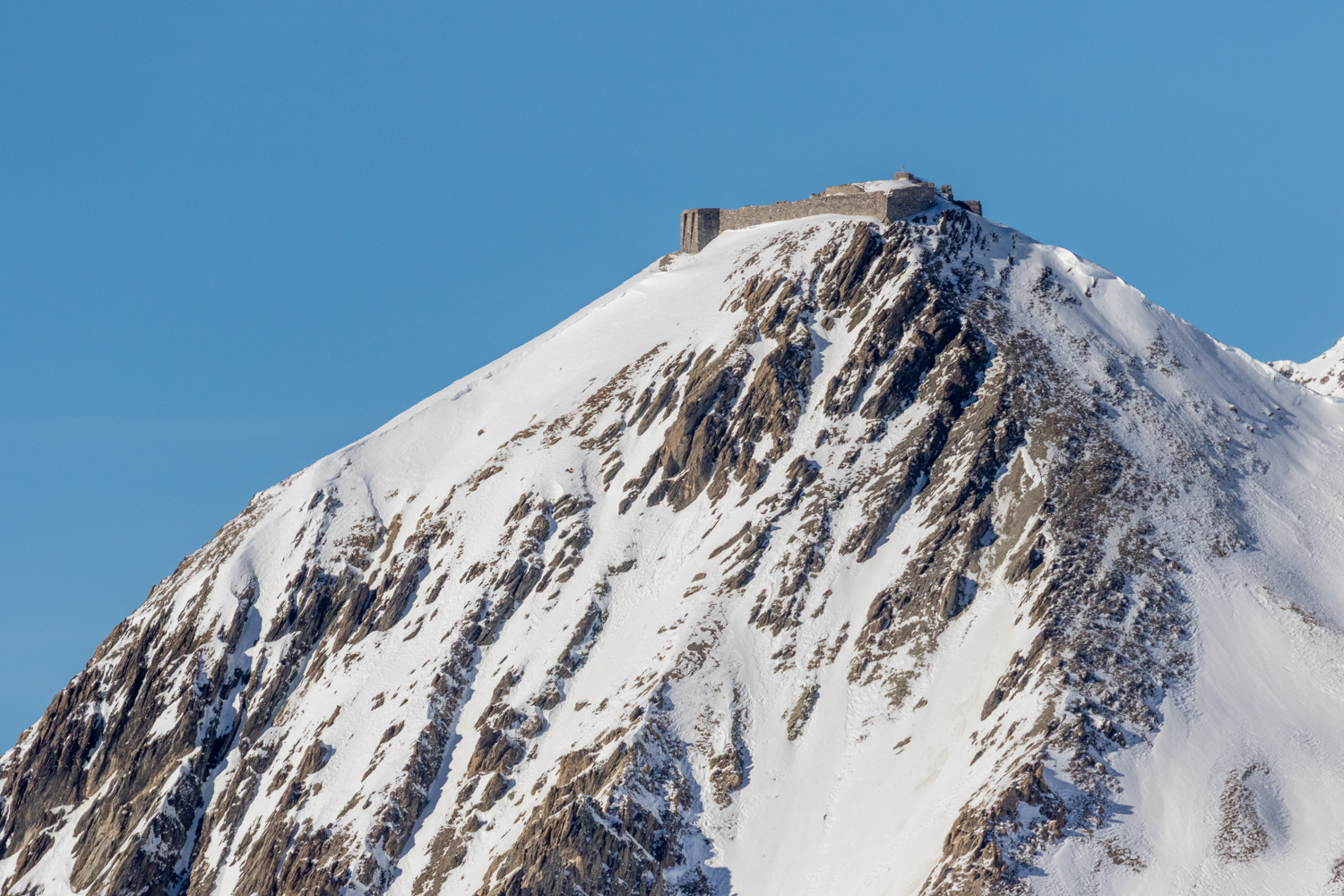 La lune commence à s'élever au-dessus des cimes tandis que les pâles rayons du soleil caressent les pierriers des versants exposés sud. C'est ici que quelques bouquetons cherchent les quelques rares touffes d'herbe. Ils sont réfugiés sur les hauteurs, hors d'atteinte de l'objectif. Mais j'apprécie le cadre et la quiétude de ce moment perdue au milieu des montagnes enneigées. C'est sous la faible lumière du crépuscule que nous suivons en zigzags le GR jusqu'au village. Quelques panneaux d'information présentent les ouvrages de la seconde guerre mondiale. Nous voilà arrachés à la rêverie de nos déambulations naturalistes et rappelés à la civilisation.