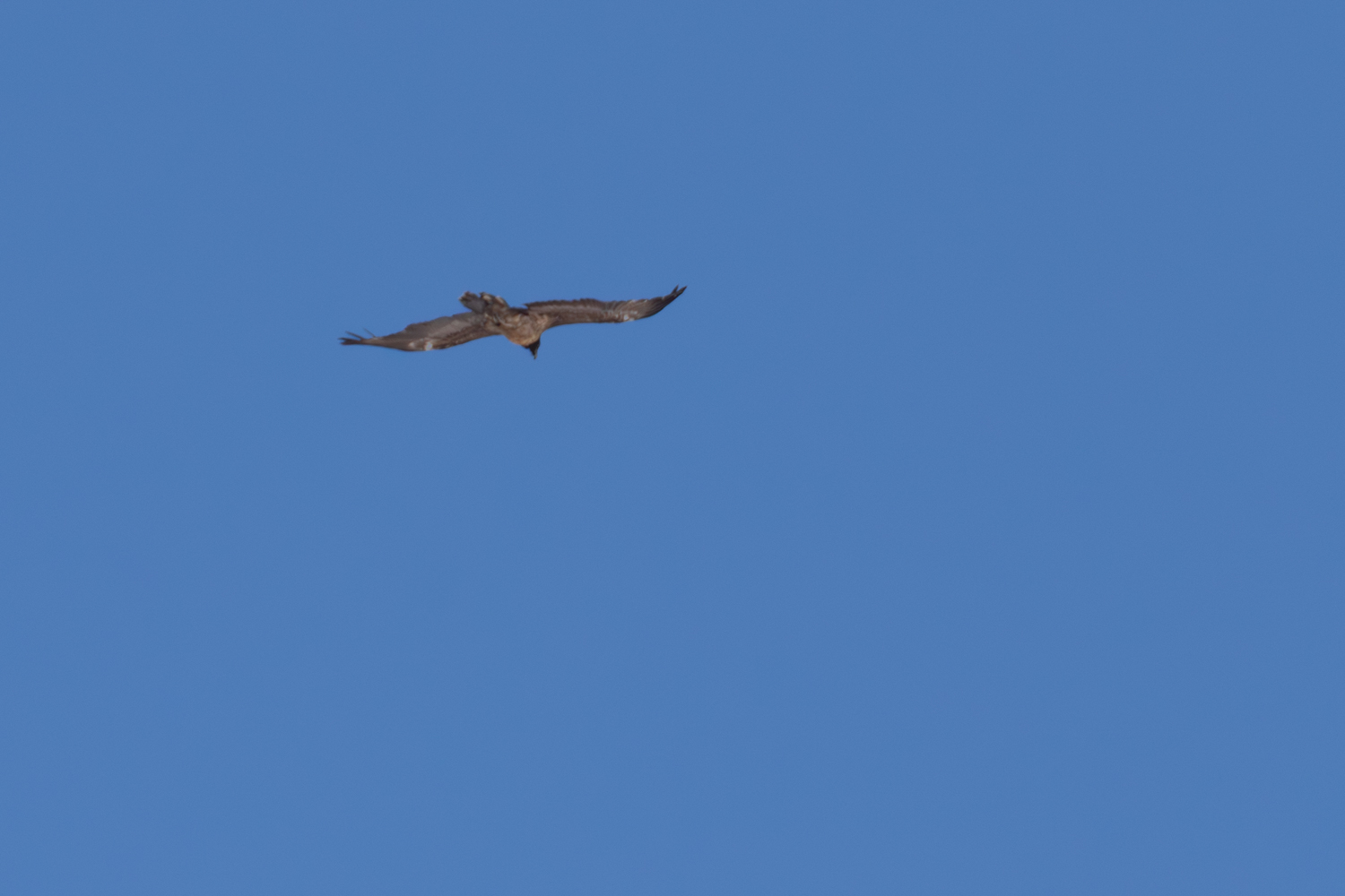 Nous trouvons assez facilement notre sentier balisé par des poteaux aux couleurs jaune et rouge et traçons tout droit. Un gypaète fait une brève apparition. J'ai à peine le temps de sortir le 100/400 du sac, qu'il est déjà loin et de dos. Un cliché pour le souvenir.