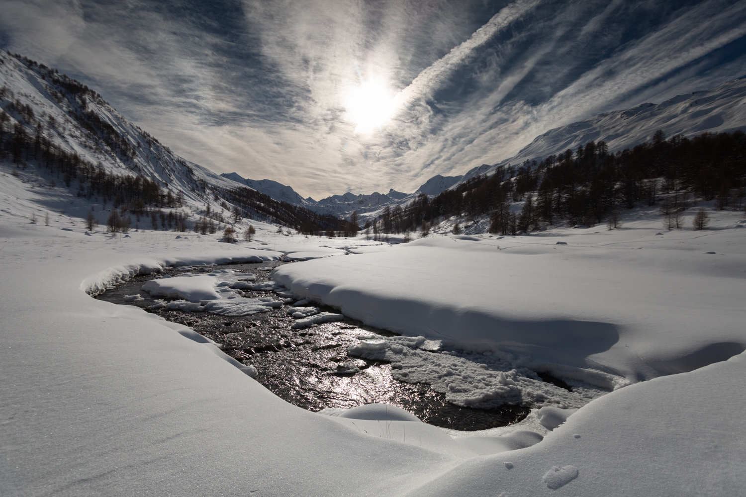 Nous traçons notre chemin au milieu de la neige. Seuls les animaux ont laissé leurs empreintes sur cette partie de l'itinéraire. Renard, hermine et ... loup. Malheureusement nous n'en croisons aucun. J'aurais tellement aimé croisé un loup dans ces territoires enneigés ! Revenu de façon naturelle d'Italie dans les années 90, le loup gris a pu peu à peu recoloniser quelques territoires où il avait été exterminé. Son retour dans les Alpes a permis de réguler les populations d'ongulés dont l'expansion n'était pas sans impact sur les forêts. Mais nous aurons beau scruter les environs aux jumelles, pas l'ombre d'un canidé à l'horizon.
