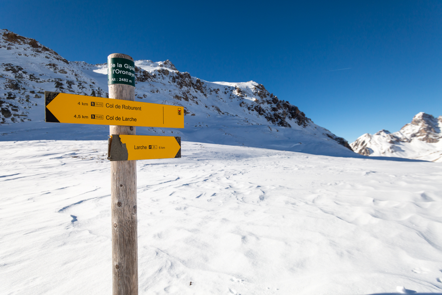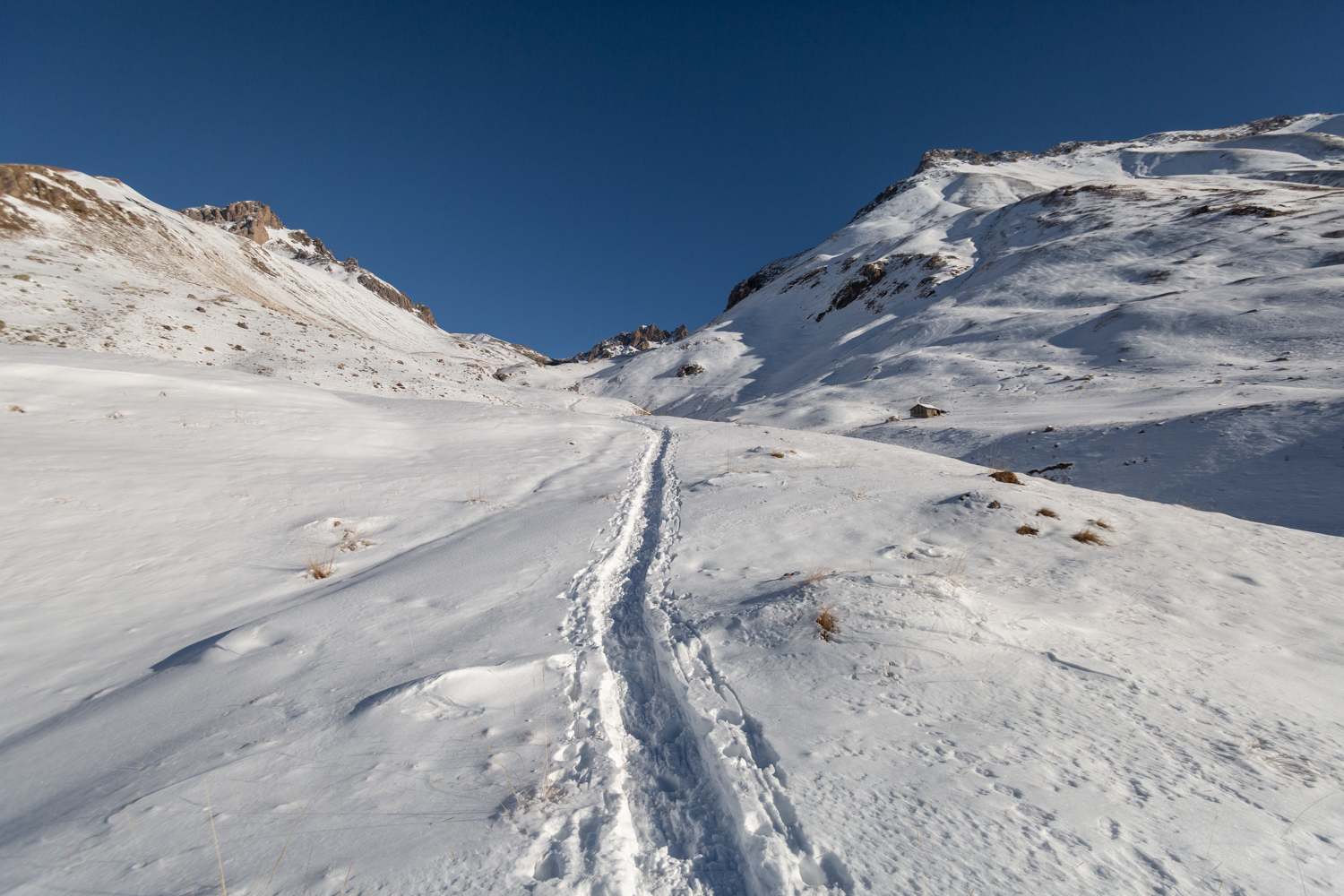 Après les belles tombées de neige du début de semaine et un grand ciel bleu ensoleillé, les conditions étaient optimales pour cette belle randonnée. Nous partons depuis le début du GR, entre le village de Larche et le col. Par chance, une personne était partie plus tôt que nous et avait laissé une trace fraîche dans la neige, facilitant notre propre ascension. Merci à lui ! Nous le croiserons d'ailleurs plus tard dans la journée ! Toute la première partie de l'itinéraire monte tranquillement le long du vallon de l'Orrenaye.