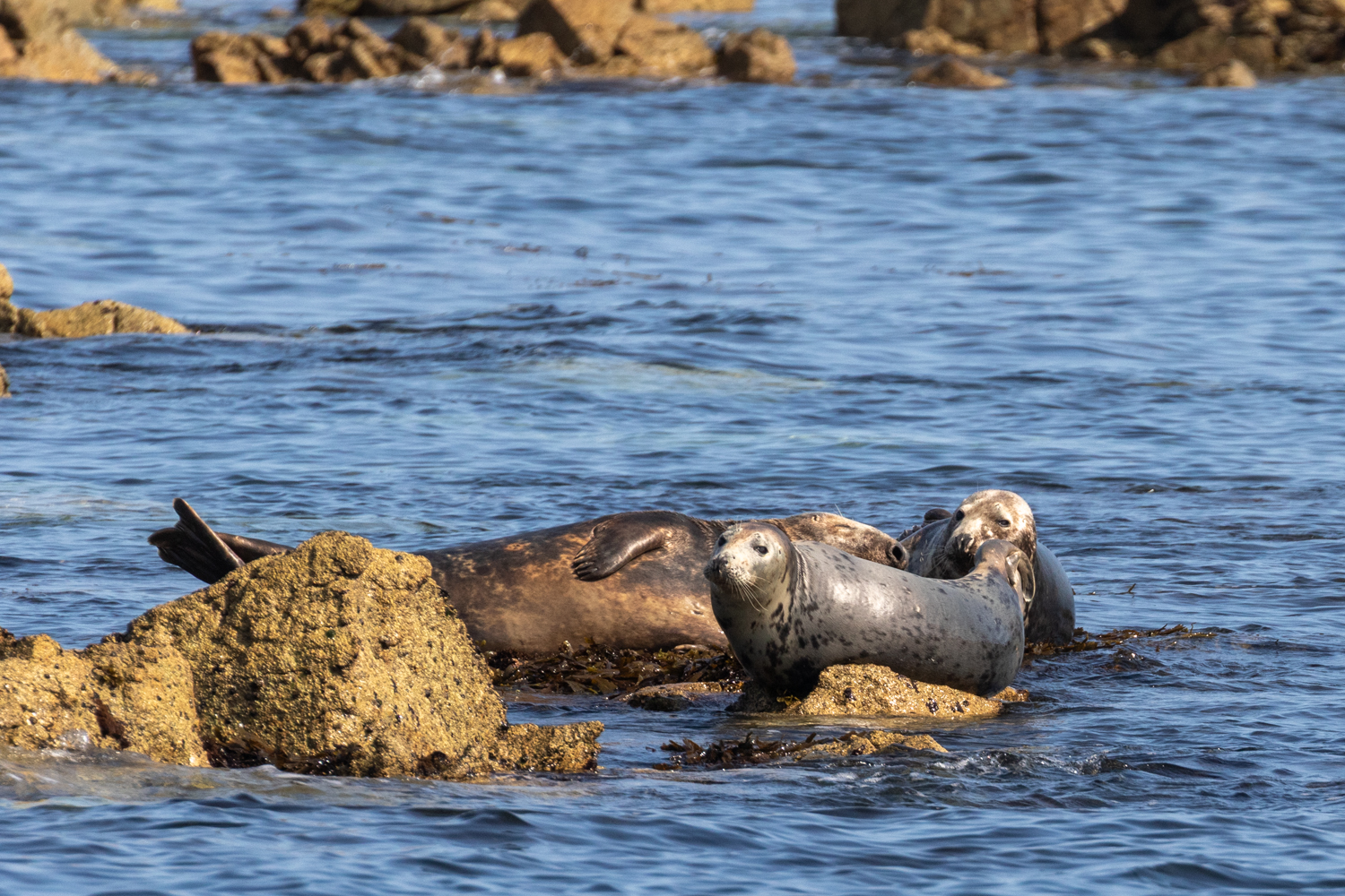 L’archipel est reconnu comme le principal site de naissance pour le phoque gris en Bretagne, accueillant une grande part des jeunes nés chaque automne et contribuant de façon significative à la conservation de l’espèce au niveau national. Les effectifs varient selon les saisons — d’une trentaine à une centaine d’individus selon les comptages. L’archipel des Sept-Iles présente 18% de la population de rang national et chaque automne, 70 % des naissances de phoque gris de rang national. Nous avons la chance d’observer quelques individus se reposant tranquillement sur les rochers. Seule cette espèce est présente ici. Le phoque veau-marin, quoique commun par ailleurs, est extrêmement rare sur les côtes bretonnes.