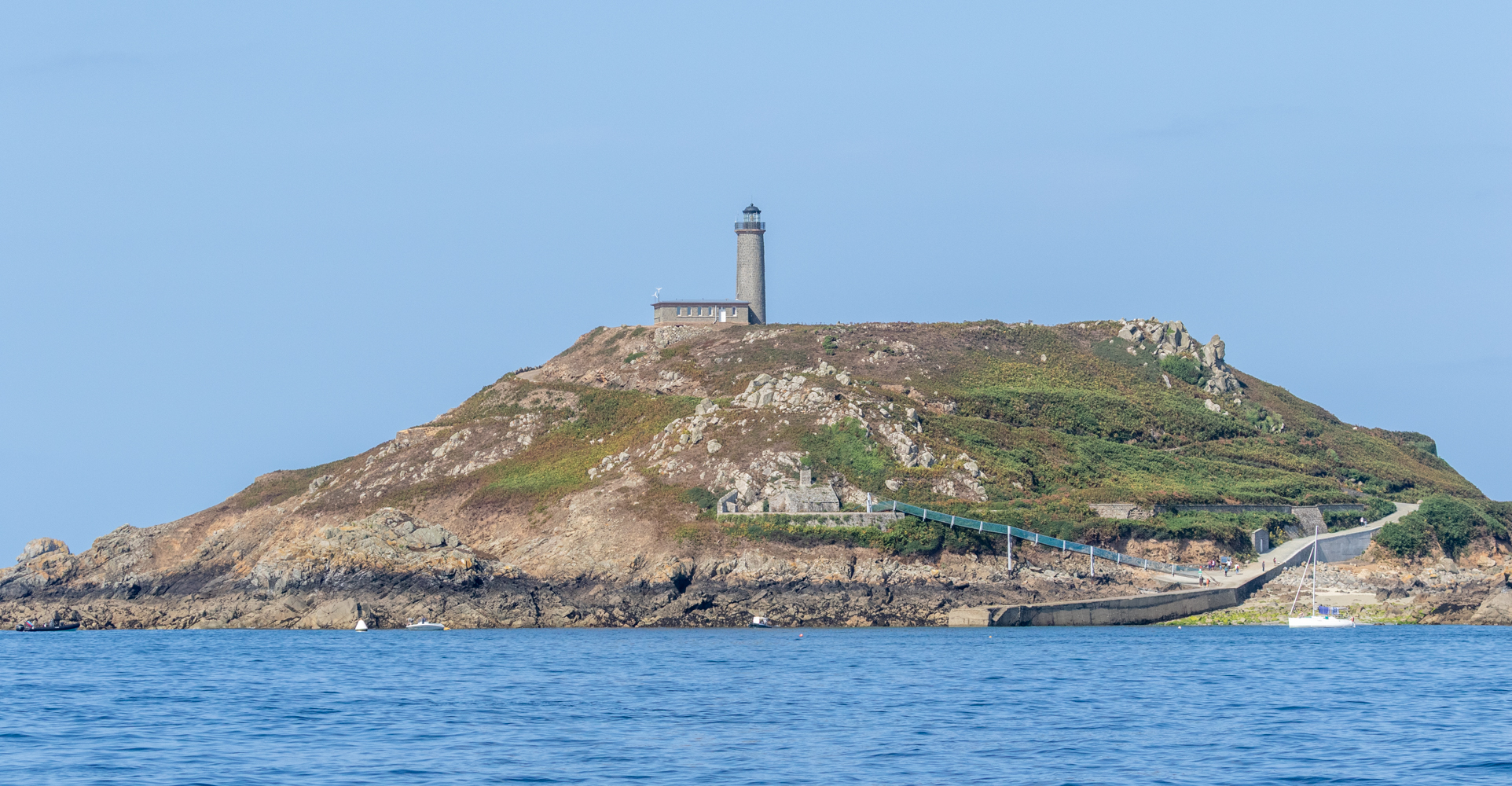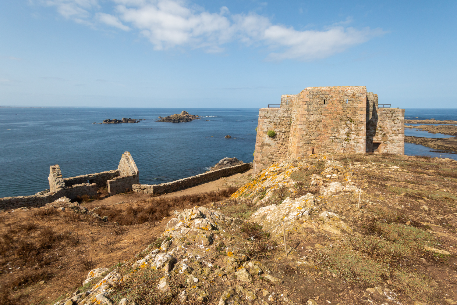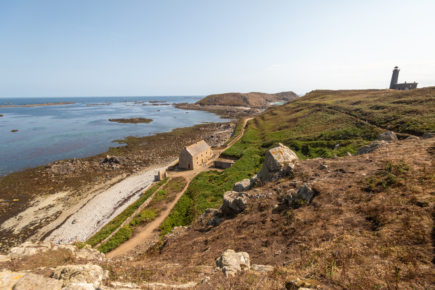 Lors du parcours sur l’île aux Moines, deux éléments du patrimoine attirent particulièrement l’attention : le fort et le phare. Édifié au XVIIIᵉ siècle, le fort rappelle le rôle stratégique de l’archipel dans la défense du littoral breton, aujourd’hui reconverti en bâtiment technique lié à la gestion de la réserve. Un peu plus loin, le phare de l’île aux Moines, mis en service au XIXᵉ siècle, se dresse face au large et continue de guider les navigateurs le long de la côte de Granit Rose.