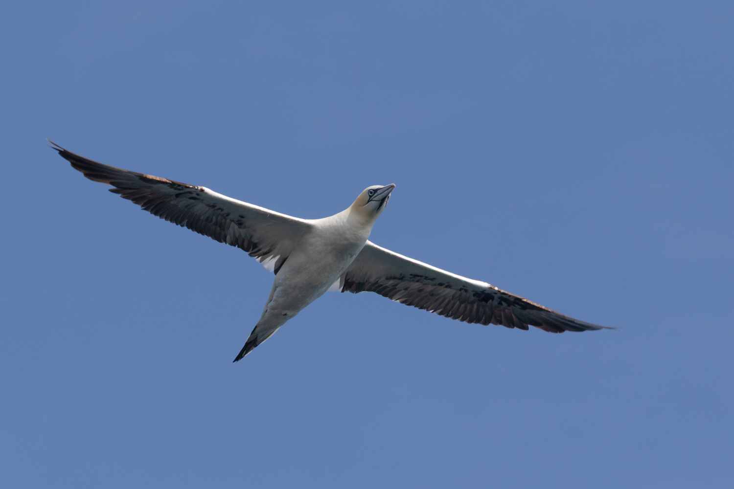 Le fou de Bassan est le plus grand oiseau marin d’Europe. Il mesure environ 85 à 100 cm de long, pour une envergure pouvant atteindre 1,80 à 2 mètres et un poids moyen de 2,5 à 3,5 kg. Sa silhouette élancée, son plumage blanc contrasté de noir et sa tête légèrement jaunâtre en font une espèce facilement reconnaissable.