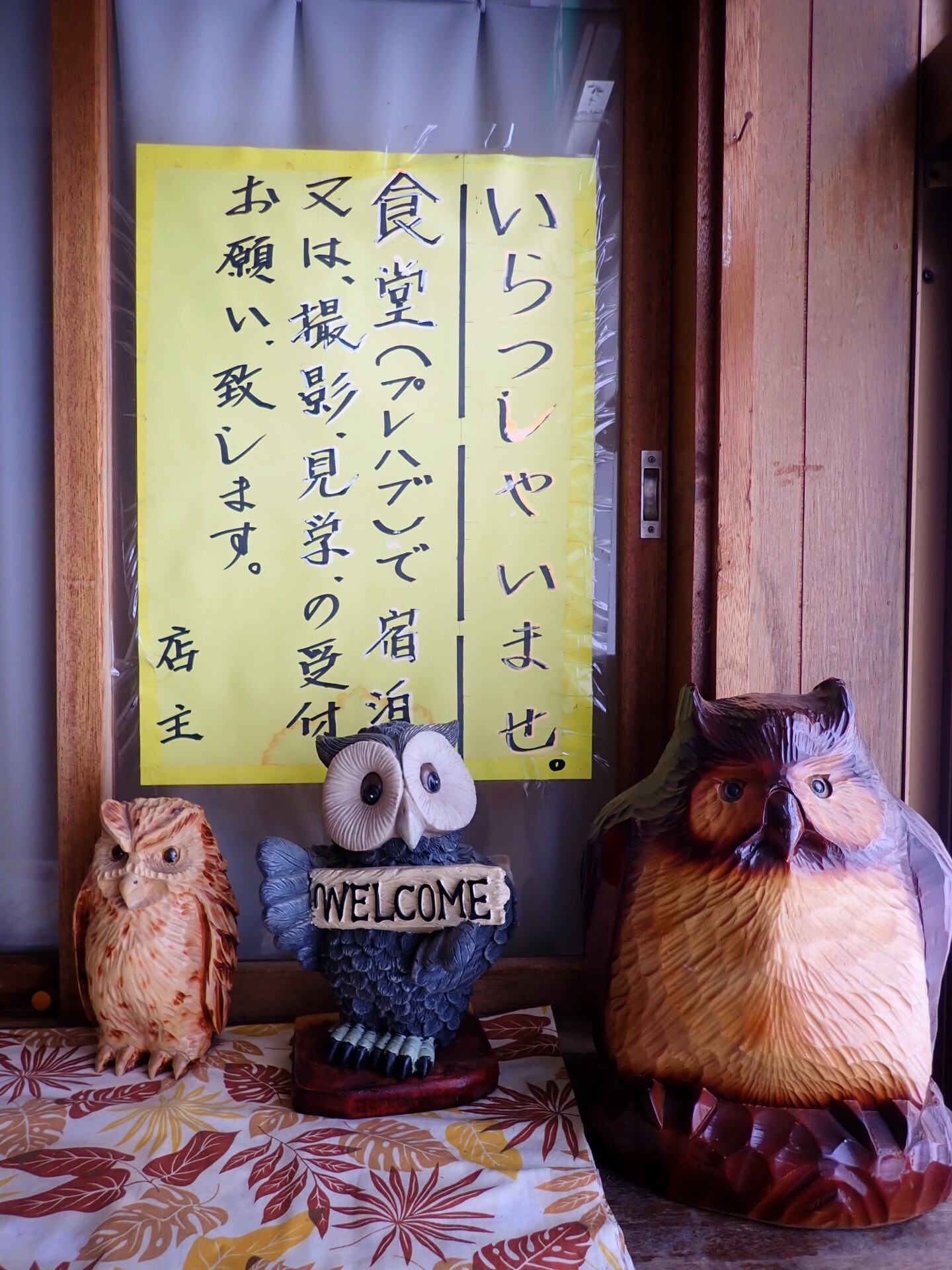 Dès notre arrivée, je suis surprise par la modestie des lieux contrastant avec la renommée du site. Deux baraquements font face à la rivière où des spots désignent l’endroit où le grand-duc se nourrit généralement une fois l’obscurité installée. Seule une fine cloison de papier sépare notre chambre, munie d’une grande baie vitrée pour l’observation, de la pièce adjacente. Les futons quant à eux sont soigneusement pliés dans un coin de notre espace. Enfin, les toilettes et la salle de bain communes se situent le long de l’étroit couloir donnant sur la chambre des propriétaires. Pour gagner la pièce commune servant à la fois d’observatoire et de salle à manger, il faut sortir. Il convient donc de limiter vos allers et venues pour éviter d’effrayer les oiseaux.