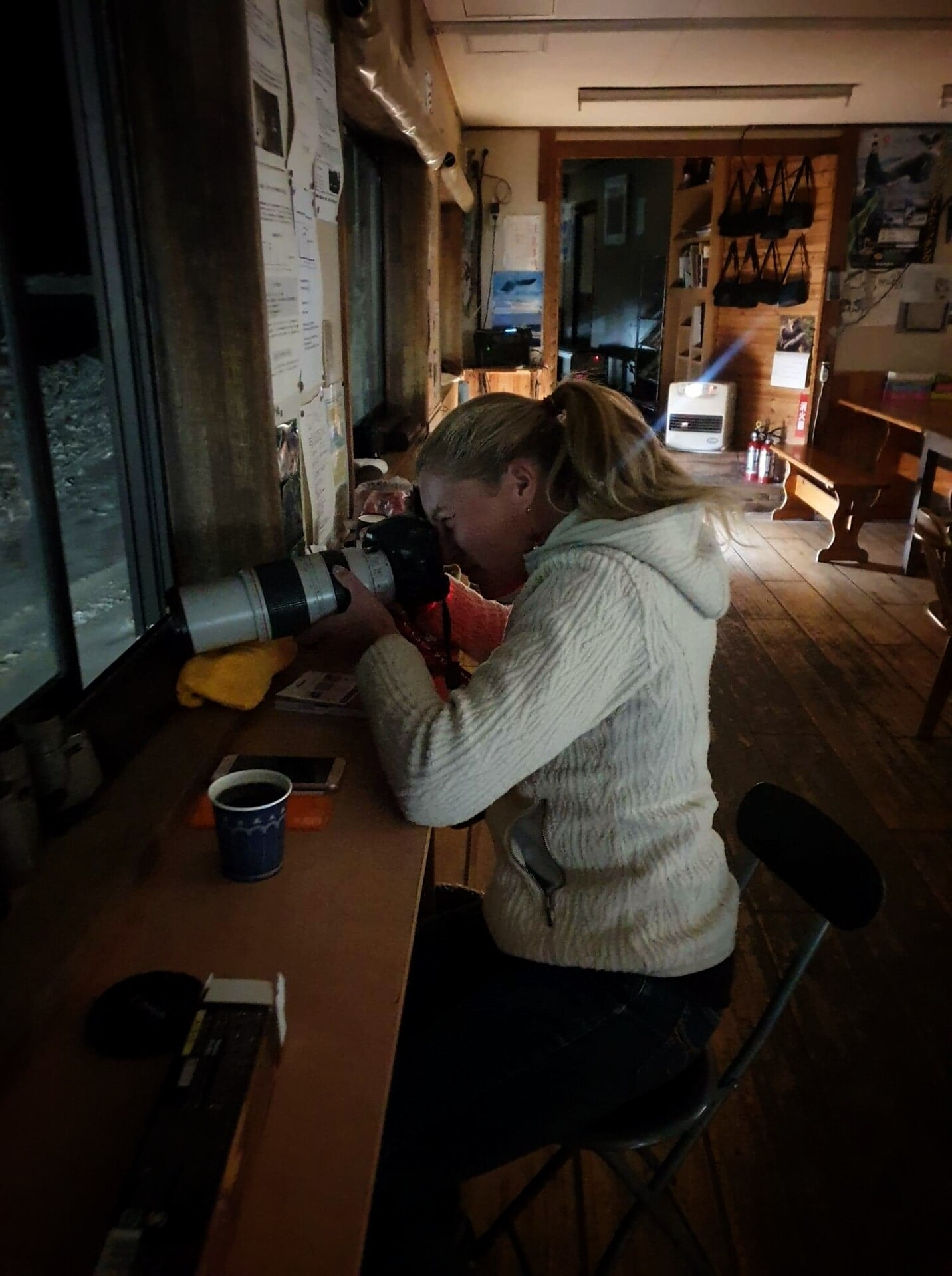 Le café à volonté augure une longue nuit d’affût alors qu’un carnet d’observation énumère les horaires de passage des oiseaux très minutieusement. Ainsi, je découvre que la veille, l’oiseau avait daigné se montrer avant le repas servi à 18h. Il passe donc régulièrement ici mais pas nécessairement tous les jours. Mais les abondantes chutes de neige du jour auront peut-être un effet sur ses habitudes ?