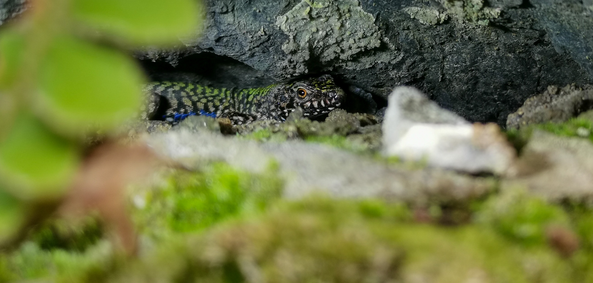 Le sentier surplombe la côte au milieu du maquis en longeant les murets. De temps à autre un lézard des murailles de la sous-espèce locale nigriventris se fait dorer au soleil.