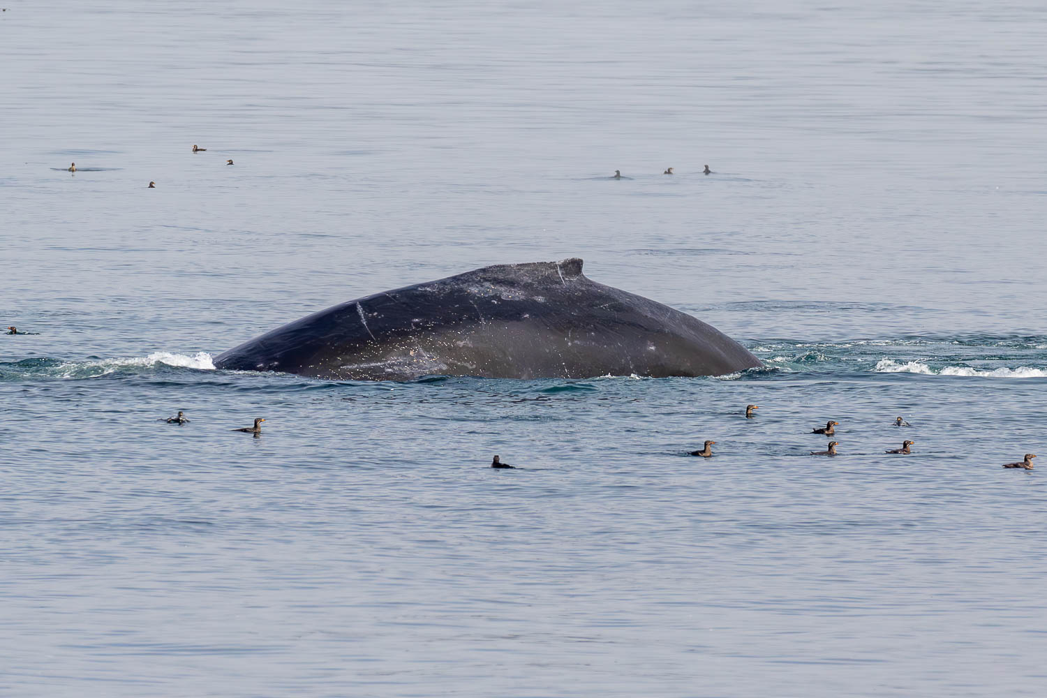 Nous reprenons la navigation et le pilote prend la direction d’un important regroupement d’oiseaux. C’est souvent sous ces regroupements que les baleines ressortent … Bingo ! une baleine fait son apparition et profite à son tour du festin ! Impressionnant !