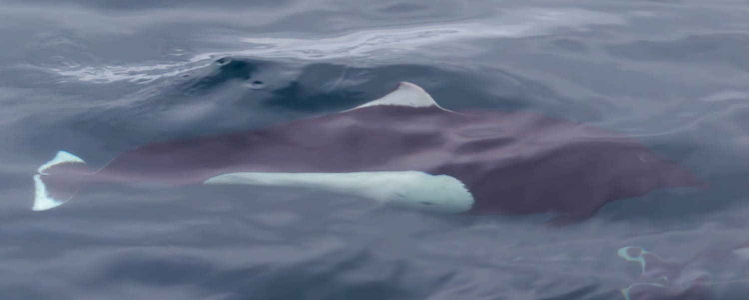 Les premiers cétacés ne tardent pas non plus à faire leur apparition. De tous petits ailerons, tracent à toute allure tels des missiles. Ils viennent au bateau : ce sont des marsouins de Dall. On les distingue des marsouins communs grâce à la pointe blanche au bout de leur aileron et leur ventre blanc. Mesurant, entre 1m80 et 2m30, il fréquente les zones côtières des eaux tempérées froides et sub-polaires du Pacifique Nord. Ces dauphins hyperactifs ont tout misé sur la vitesse. Si les marsouins communs utilisent des sons inaudibles aux orques et passent pour ainsi dire incognito, les marsouins de Dall utilisent leur rapidité pour échapper aux prédateurs. Ils ne nous accompagnent pas très longtemps et filent bientôt dans une nouvelle direction.
